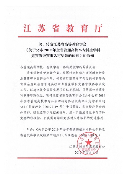 根据《省教育厅办公室关于组织2019年全省普通高校本专科生学科竞赛申报工作的通知》(苏教办高函〔2018〕47号)有关要求,各高校自主申报55项学科竞赛项目,经专家评审及结果公示,认定其中17项学科竞赛项目为“省级赛事”(见附件1),认定14项学科竞赛项目为“省级赛事培育”(见附件2)。