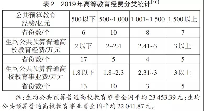 其次,省域高等教育的差异体现在高等教育的经费投入上。现代高等教育的发展离不开大量的经费投入。从许多国家近年来的高等教育发展看,经费投入往往与高等教育的规模、水平成正比。国际上各国对高等教育的经费投入大致有三种类型,一是以政府公共预算经费为主,二是政府公共预算经费与社会其他经费(学费、捐赠等)基本平衡,三是以社会其他经费为主。在我国高等教育的经费投入中,政府公共预算经费是主要部分。如2018年,我国普通高校总经费11858.77亿元中,政府财政性教育经费投入7449.11亿元,占总数的62.82%。在高等教育分省发展的格局下,地方政府的经费投入对省域高等教育的规模与水平的影响是十分重要的。而地方经济发展的不平衡使得省域高等教育经费投入存在明显差异。从公共预算教育经费的总量来看,2019年500亿元以下有6个省份,1500亿元以上有7个省份,其中广东省3217.77亿元,江苏省2200.58亿元,山东省2154.96亿元。生均公共预算普通高校教育经费全国平均23453.39元,低于2万元的有17个省份,其中河南省15475.95元,广西壮族自治区15534.07元,辽宁省15876.12元;高于3万元的有5个省份,其中北京市68139.62元,西藏自治区58549.52元,上海市39702.78元。生均公共预算普通高校教育事业费全国平均22041.87元,低于1.8万元的有13个省份,其中辽宁省14721.91元,广西壮族自治区14919.78元,河南省14933.74元;高于3万元的有5个省份,其中北京市64022.10元,西藏自治区52383.22元,青海省40453.35元。西藏自治区、青海省等西部省份生均公共预算高等教育经费较高显然有中央政府的财政支持因素。省域之间生均公共预算高等教育经费的过大差异加剧了高等教育发展的不平衡,不利于落实高等教育的公平原则。(见表2)