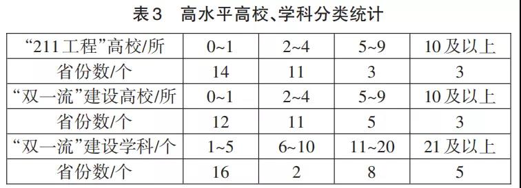 第三,省域高等教育的差异体现在高等教育的发展水平上。规模、投入与水平,这三者是影响高等教育体系状况的主要因素。而就高质量高等教育体系建设而言,水平因素显得更为重要。在一定程度上,高质量与高水平的意涵是基本相同的。近年来,随着教育评价理念、方法与技术的不断改善,有关高等教育发展水平的指标日渐丰富。对于省域高等教育发展水平的评价来说,除人才培养、科学研究、学科建设、社会服务等与高校发展水平评价相同的指标之外,院校结构、治理体系等方面的指标也是不可缺少的。囿于篇幅,这里不可能全面比较省域高等教育的发展水平,仅从表3所列有代表性的数据来一窥省域高等教育发展水平的面貌。可以看到,我国省域高等教育在发展水平上存在着较大的差异。“211工程”与“双一流”建设是自20世纪90年代以来我国实施的具有典型意义的高水平大学建设项目,各省份入选这两个项目的高校与学科数量在一定意义上可以反映出省域高等教育的发展水平。全国入选“211工程”的高校有115所,14个省份只有1所高校入选,入选10所以上高校的有3个省份,北京市26所,江苏省11所,上海市10所。全国入选“双一流”建设项目的高校有137所,12个省份只有1所高校入选,入选10所以上高校的有3个省份,北京市34所,江苏省15所,上海市14所。全国入选“双一流”建设的学科有465个,入选5个“双一流”建设学科以下的省份有16个,入选21个以上“双一流”建设学科的省份有5个,北京市161个,上海市57个,江苏省43个。北京、上海、江苏3个省(市)入选“211工程”的高校数合计占全国入选高校总数的40.7%,入选“双一流”建设的高校数合计占全国入选总数的46.0%,入选“双一流”建设学科的学科数合计占全国入选总数的56.1%。这些数据从一个侧面表明,在“211工程”到“双一流”建设的20多年间,省域高等教育发展水平的差异似有一种扩大的倾向。(见表3)