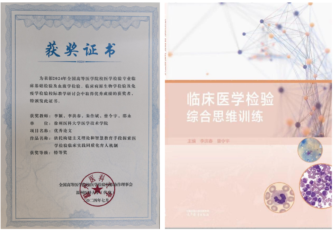 2024年全国高等医学院校医学检验专业教学研讨会优秀论文特等奖获奖证书及《临床医学检验综合思维训练》封面(暂定)如下: