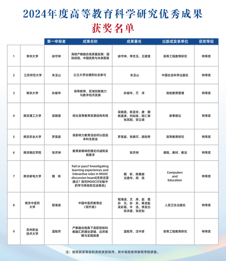 《高校产教融合高质量发展: 国际经验、中国优势与未来图景》《公立大学治理的社会参与》《高等教育、区域创新能力与数字经济发展》《优化高等教育资源结构布局》等研究成果荣获2024年度高等教育科学研究优秀成果特等奖。