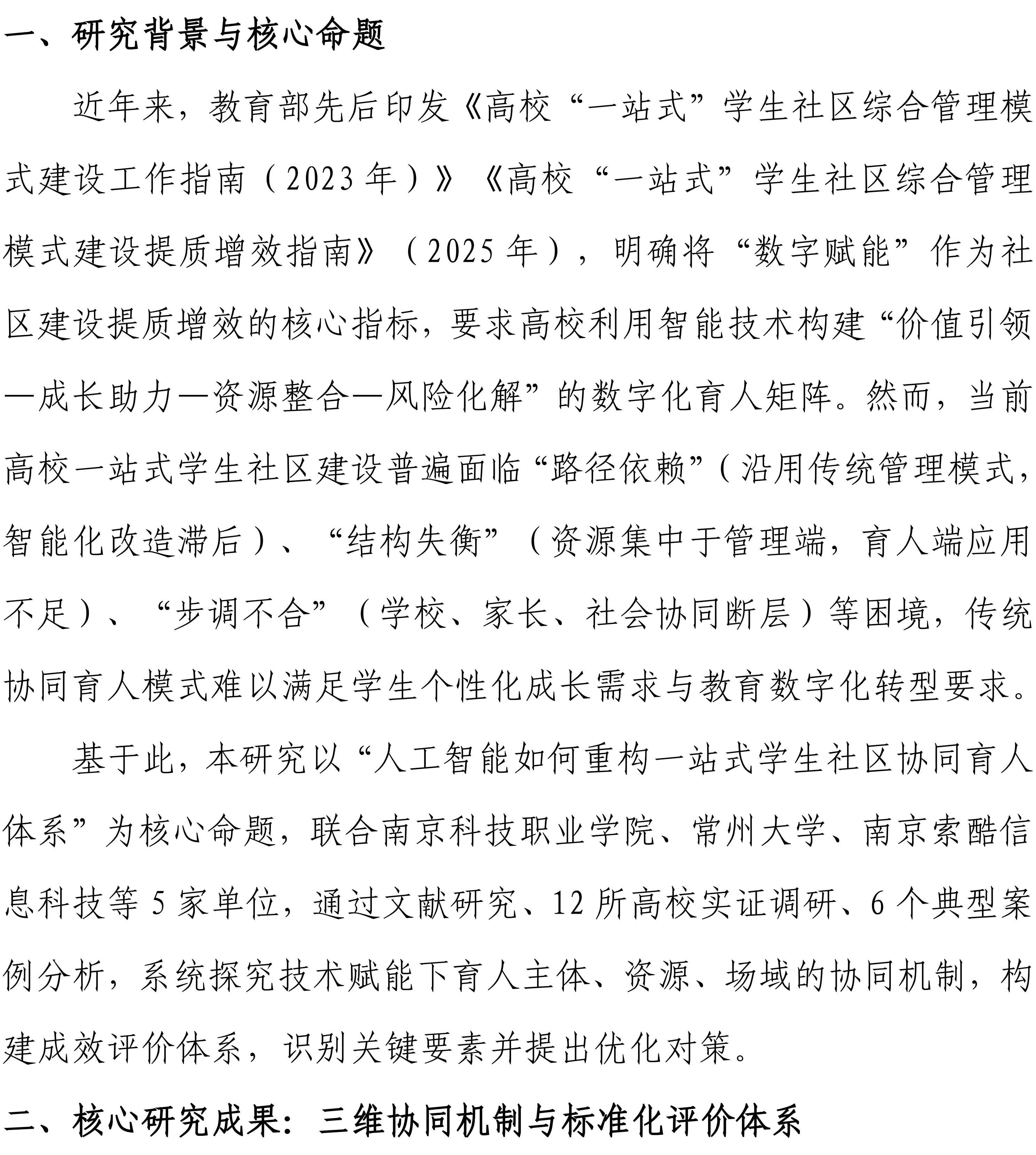 南京科技职业学院赵梦甜、张池主持完成了“2024年高等教育数字化转型与教育现代化实践研究”专项课题“人工智能赋能一站式学生社区协同育人模式研究”(课题编号:2024CXJG071),课题组主要成员:徐春芳、王北、刘峰、杨典、欧阳颖琪、高薇、孙菊先、许建民