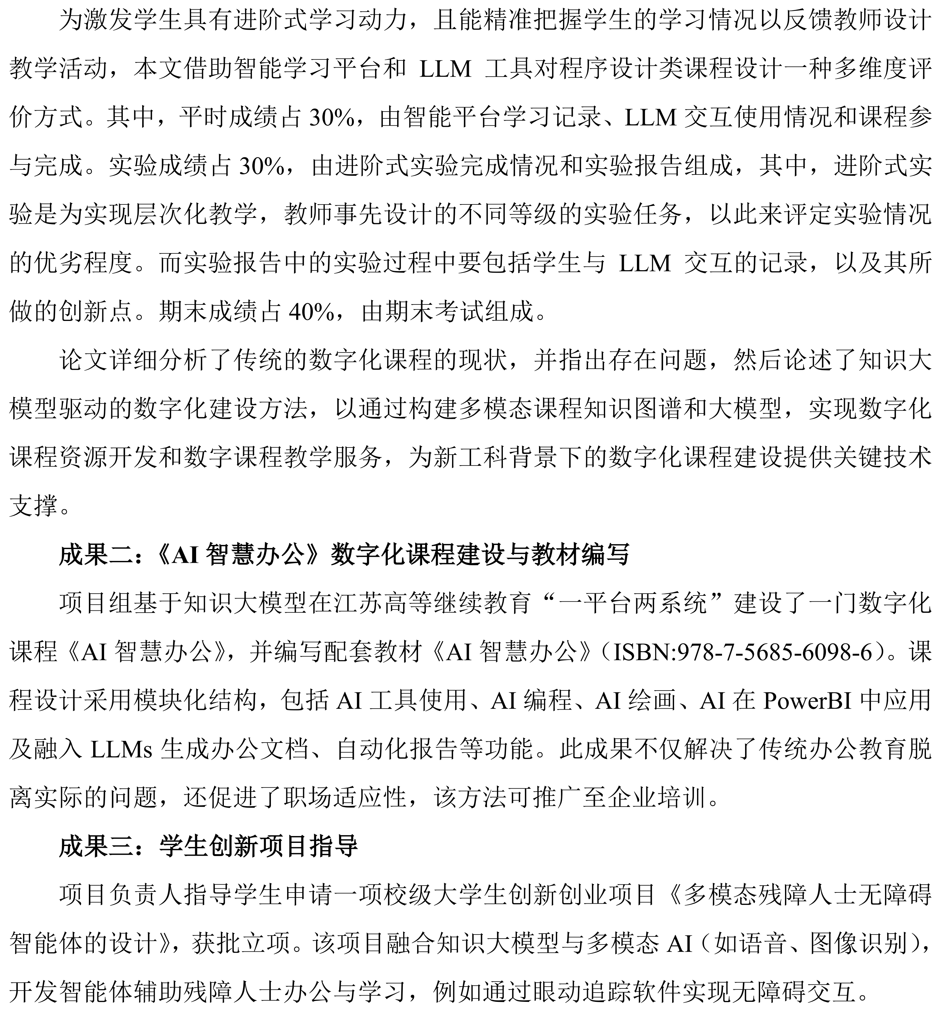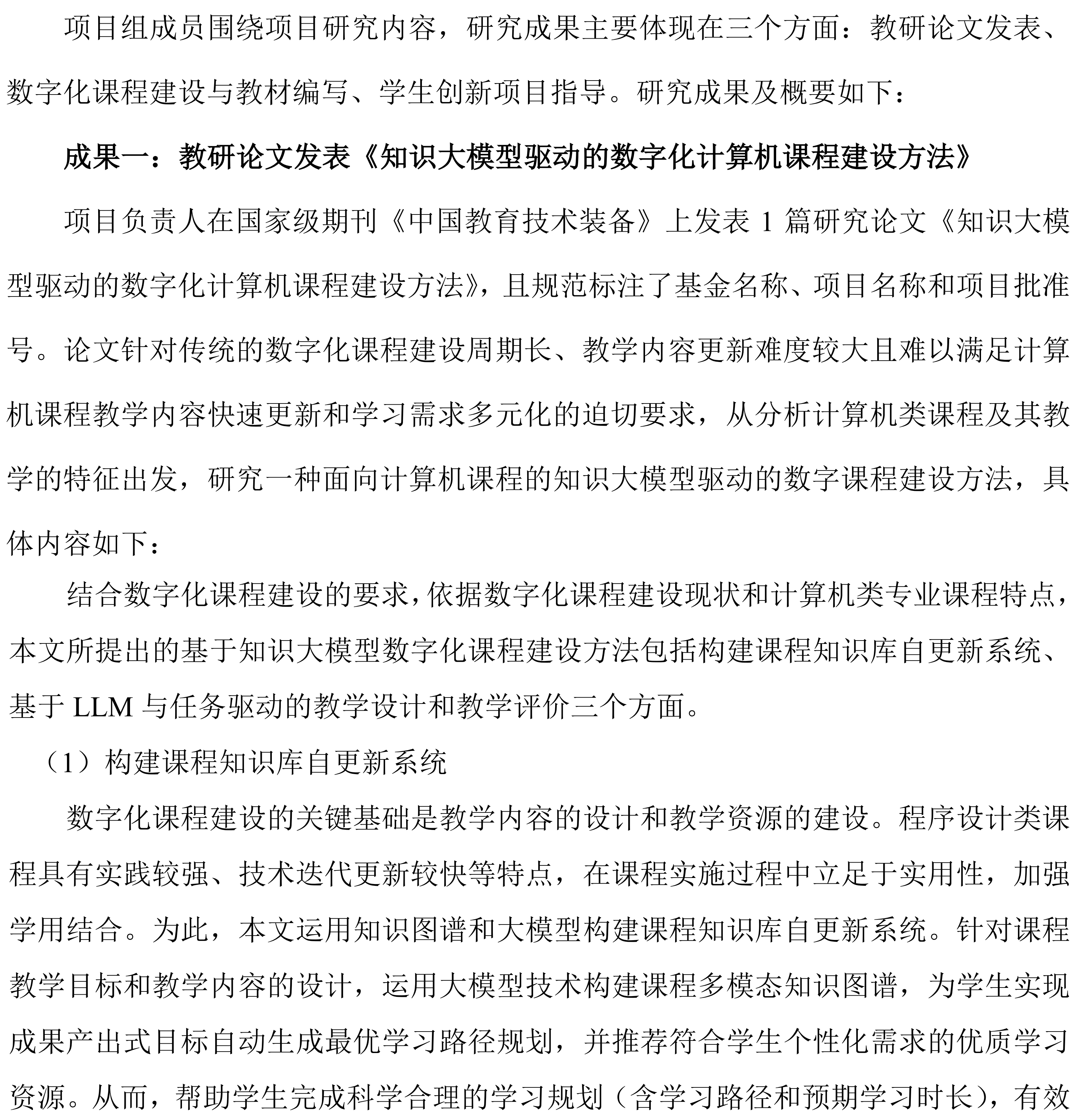 南京特殊教育师范学院路红主持完成“2024年高等教育数字化转型与教育现代化实践研究”专项课题“基于知识大模型的数字化课程建设方法研究”(课题编号:2024CXJG147),课题组主要成员:陈仲珊、王兵、付荣、殷路、王立平