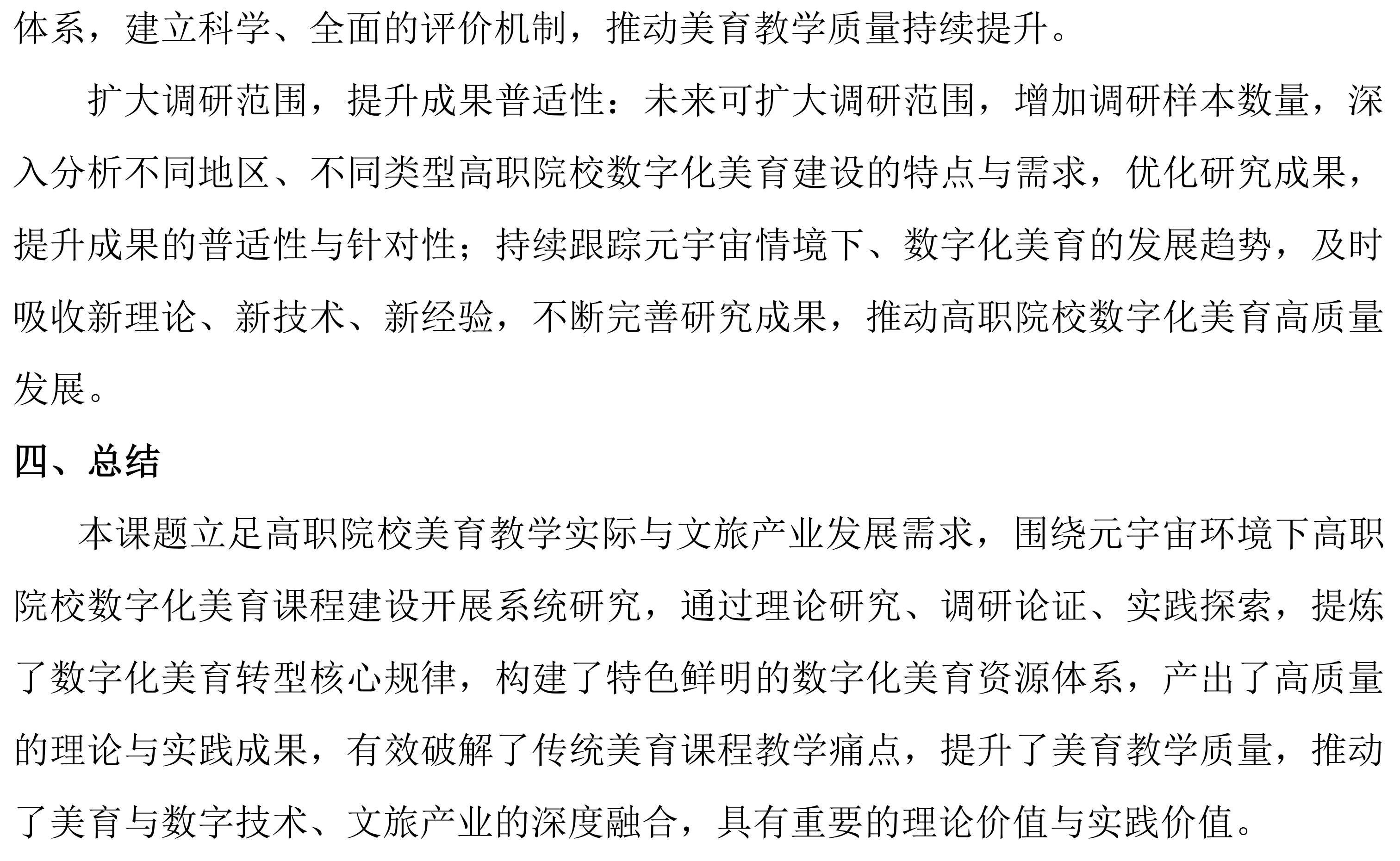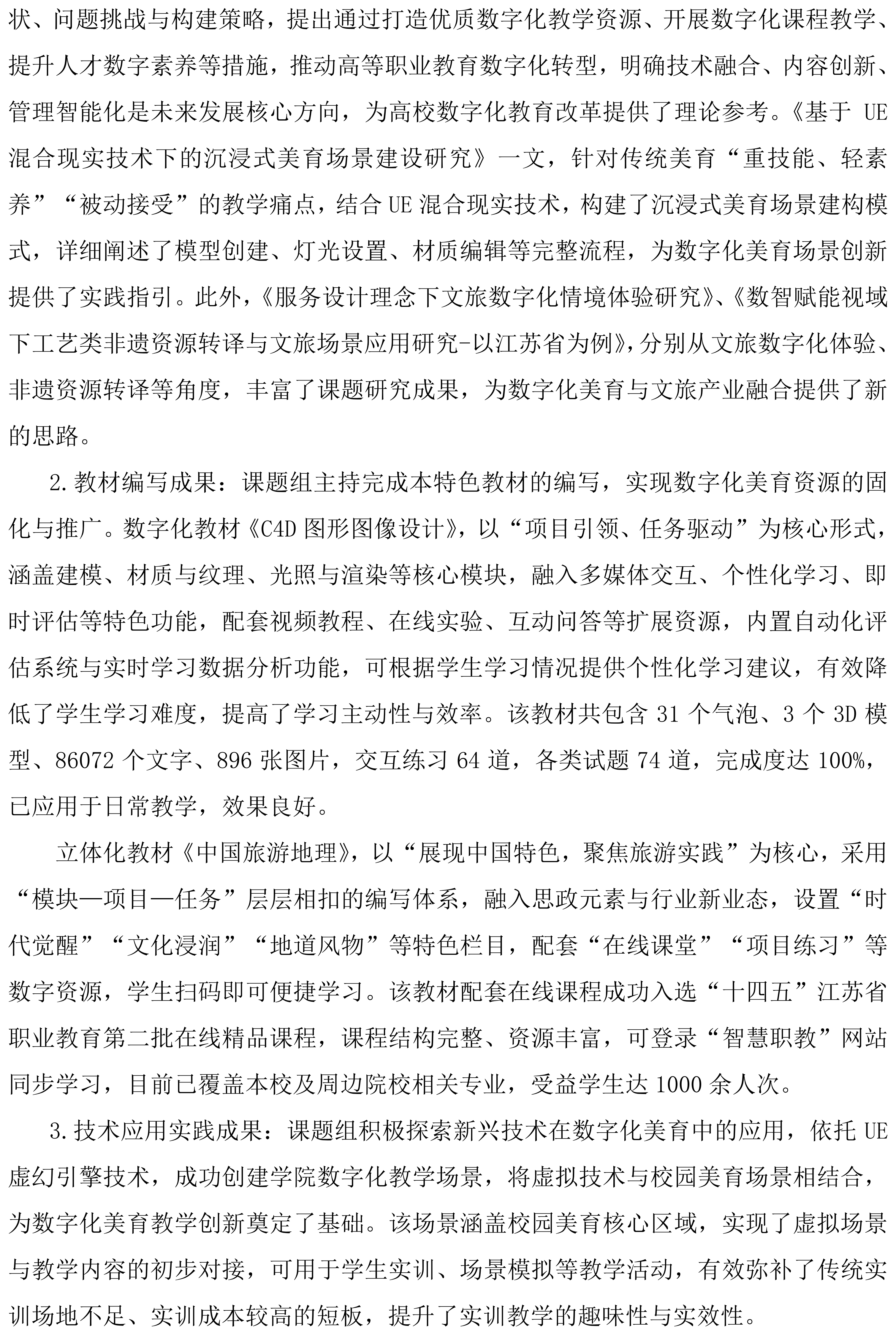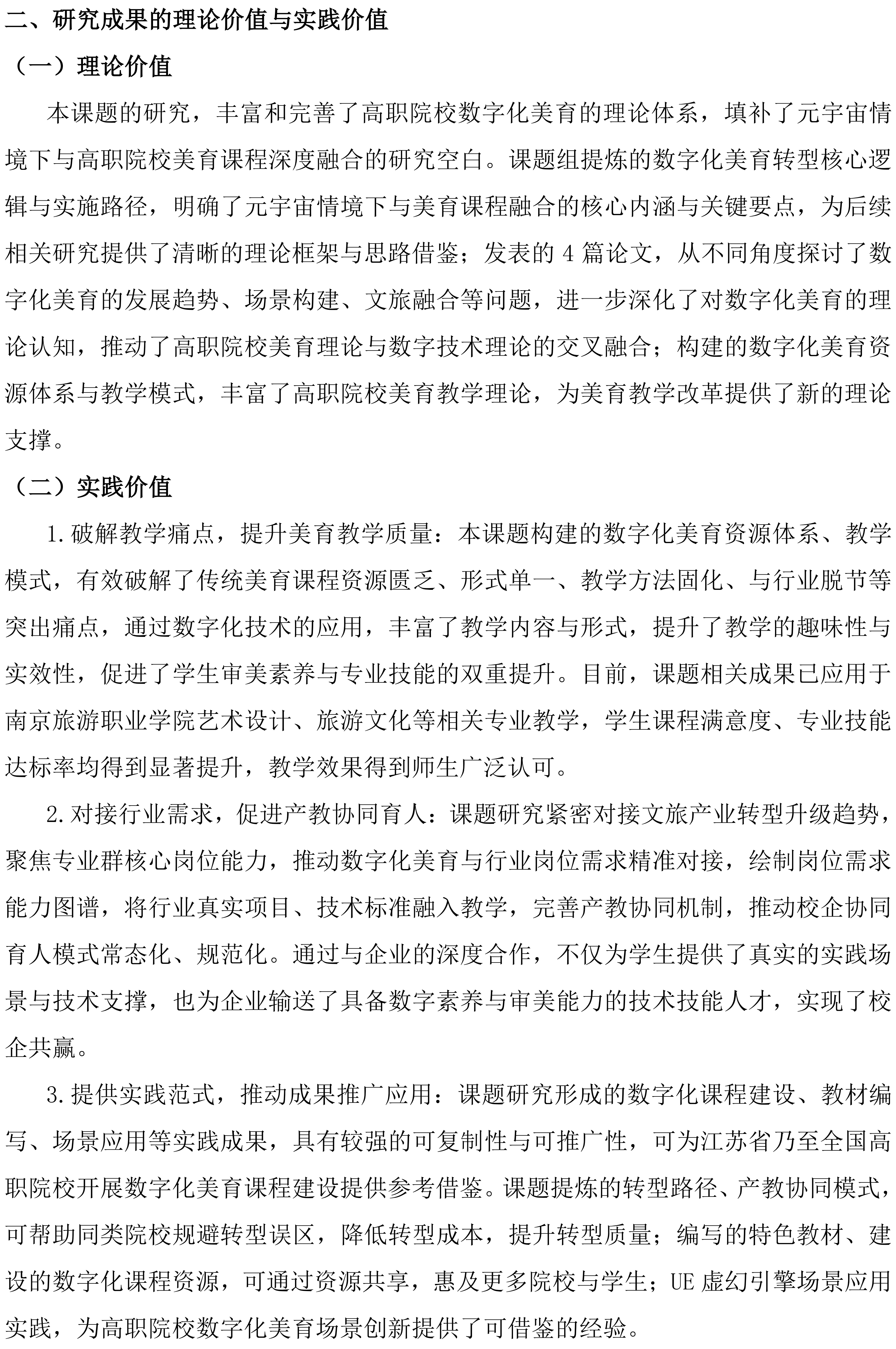 南京旅游职业学院孙维朕、孙斐主持完成2024年江苏省高校“高质量公共课教学改革研究”专项课题“元宇宙环境下高职院校数字化美育课程建设研究”(课题编号:2024GZJX160),课题组主要成员:姚景远、陈璐、曹琴、牛小丽、沈征、徐白虹