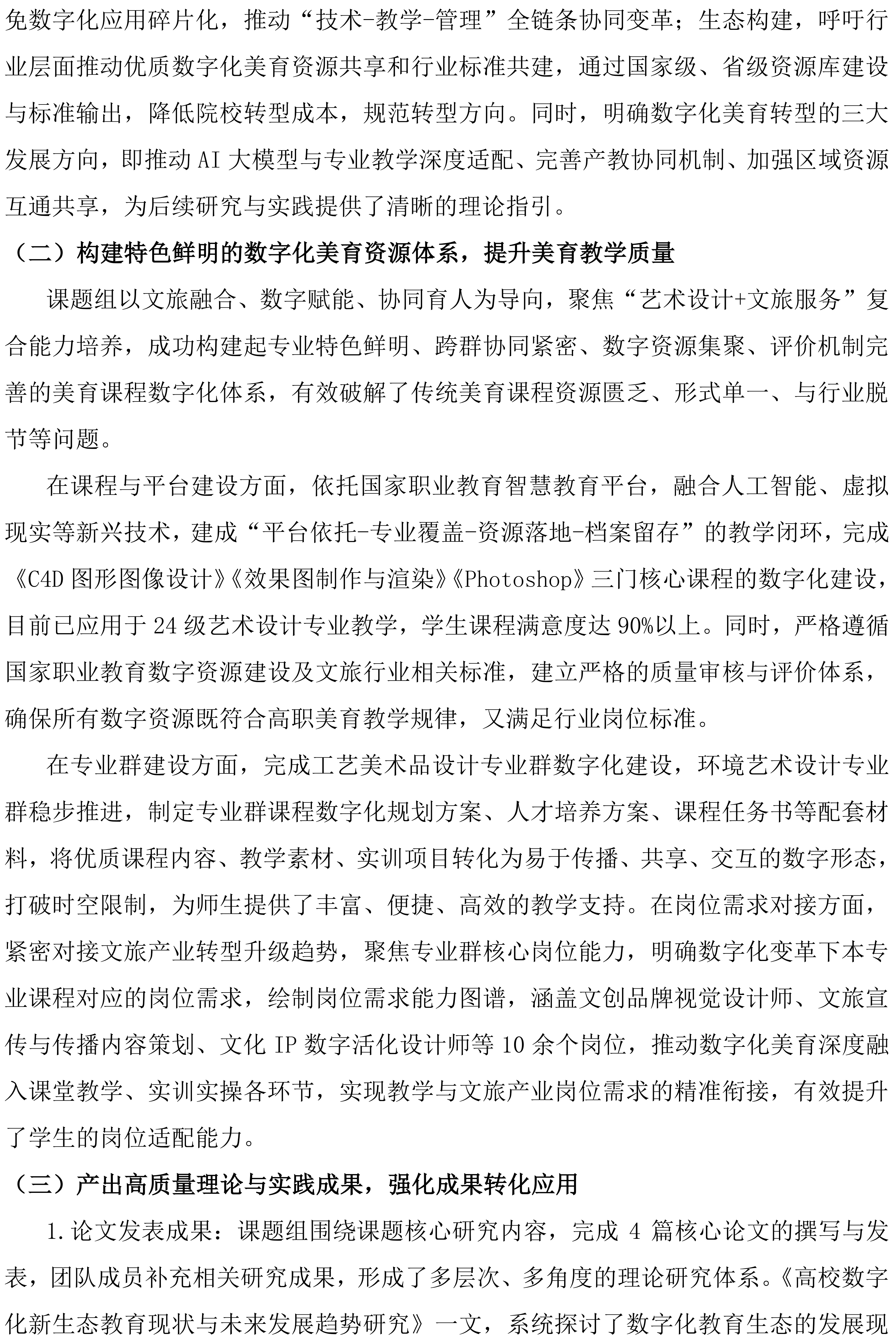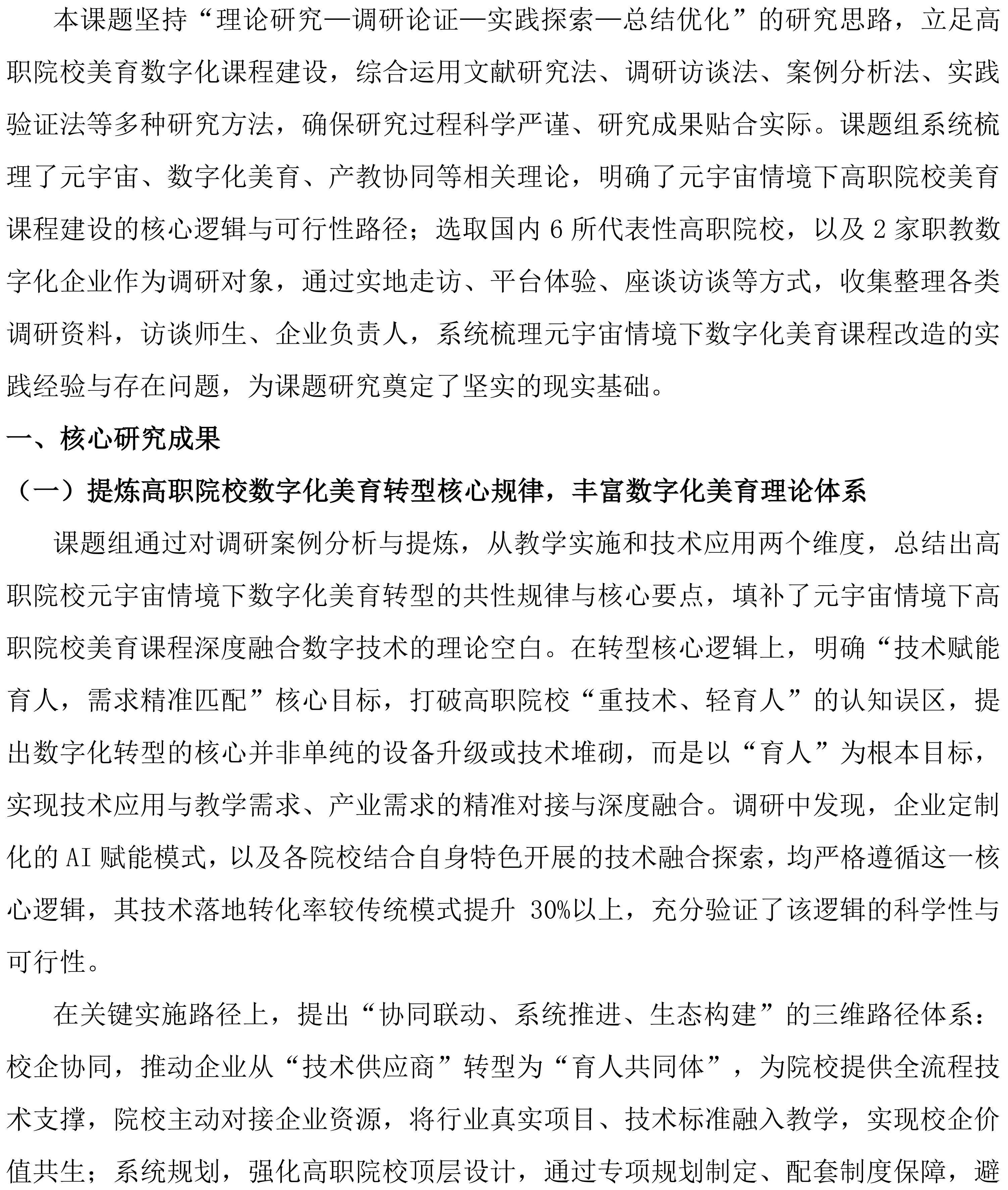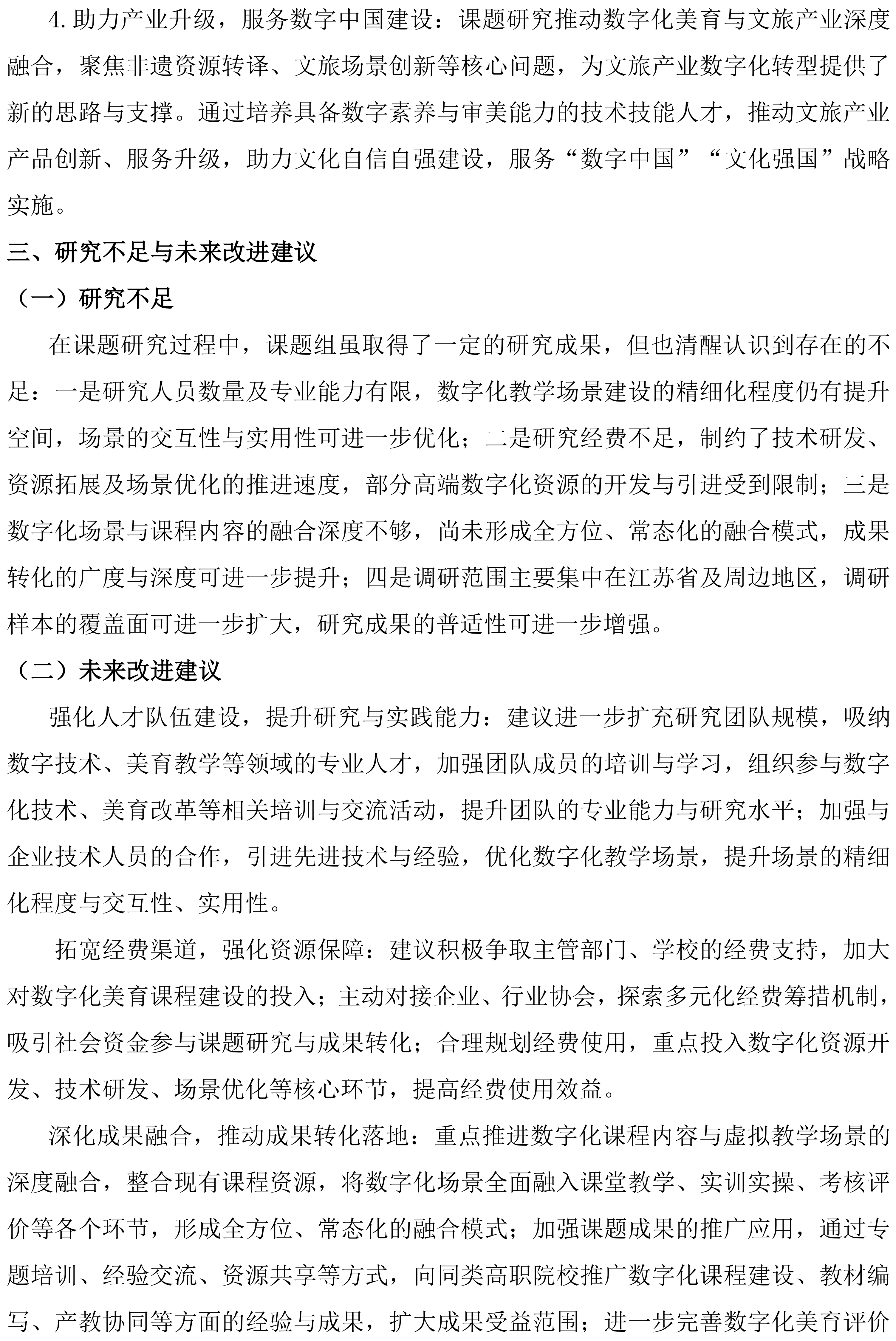 南京旅游职业学院孙维朕、孙斐主持完成2024年江苏省高校“高质量公共课教学改革研究”专项课题“元宇宙环境下高职院校数字化美育课程建设研究”(课题编号:2024GZJX160),课题组主要成员:姚景远、陈璐、曹琴、牛小丽、沈征、徐白虹